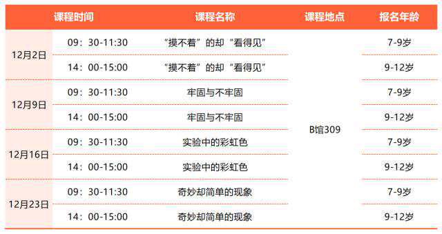 11月30日,记者从湖南省科学技术馆获悉,该馆12月周末科学营课程出炉,同时该馆与湖南师范大学科普志愿者合作课堂也将全新开课。欢迎各位学生体验科学小实验的魅力。
