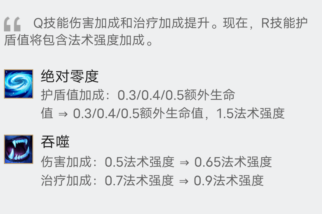 雪人的Q技能吞噬由0.5法强变成了0.65法强,治疗加成由0.7的法术加成增强至0.3的法术加成,R技能的护盾额外增加了1.5法强的加成。