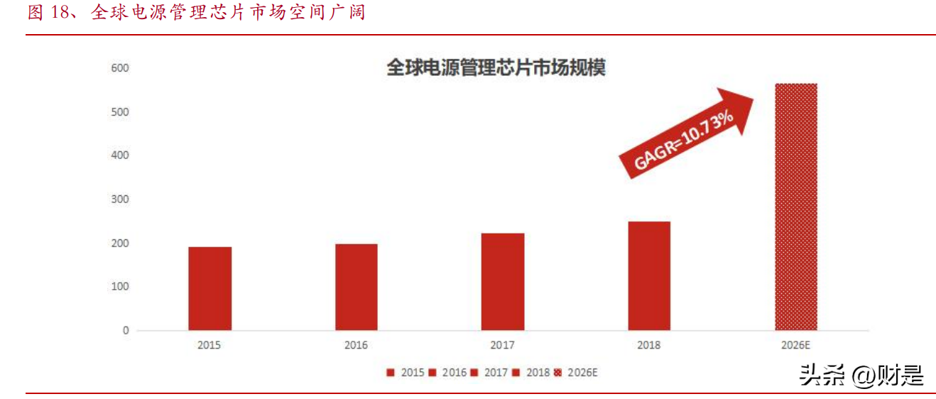 电源管理芯片是电子设备中的关键器件。电源管理芯片是在集成多路转换器的基础上,集成了智能通路管理、高精度电量计算,以及智能动态功耗管理功能的器件,可在电子设备中实现电能的变换、分配、检测等电能管理功能。由于不同设备对电源的功能要求不同,为了使电子设备实现最佳的工作性能,需要对电源的供电方式进行管理和调控。电源管理芯片在各类电子设备中发挥电压和电流的管控功能,针对不同设备的电源管理芯片其电路设计各异,同时电子设备中的不同芯片在工作中也需要配备不同的电压、电流强度,在电子设备中有着广泛的应用。电源管理芯片性能优劣和可靠性对整机的性能和可靠性有着直接影响,是电子设备中的关键器件。全球电源管理芯片市场空间广阔。根据前瞻产业研究院统计,2018年全球电源管理芯片市场规模约250亿美元左右,随着通信终端、雷达、新能源汽车等下游市场持续成长,预计2026年全球电源管理芯片市场规模有望增长至565亿美元,期间复合增长率为10.73%,市场空间广阔。
