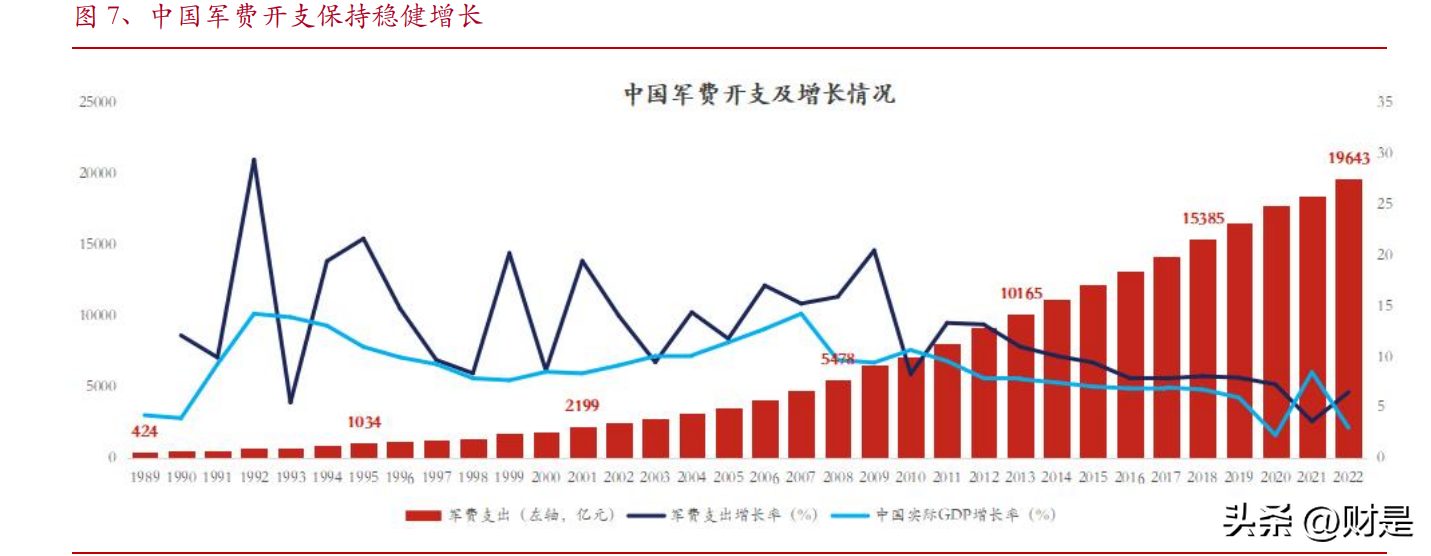 国内军费开支保持稳健增长。根据世界银行数据,按人民币本币计算,1995年我国军费开支突破1000亿元,2001年突破2000亿,2008年突破5000亿,2013年突破1万亿,2018年突破1.5万亿。另外除极少数年份之外,军费开支的增速整体要高于GDP的实际增速,比如2021年受疫情影响,全年军费开支为18448亿元,同比增长3.61%低于当年%的实际增速。随着疫情影响因素逐步消退,2022年我国军费开支为19643亿元,同比增速也恢复到6.48%,远高于当年2.99%的GDP实际增速。考虑到近年来全球地缘政治的不稳定性,预计我国军费开支仍将保持稳健增长,并且整体增速将继续高于GDP的实际增速(可参考2018-2022年5年平均增速为6.66%);另外根据中国财政部发布的2023年《政府预算(草案)》报告显示,2023年我国国防费预算约为1.55万亿元,同比增长7.2%,回顾2020-2022年,国防预算增速分别为6.6%、6.8%、7.1%,同样保持稳健增长。综上我们预计2023年我国军费开支有望突破2万亿元。