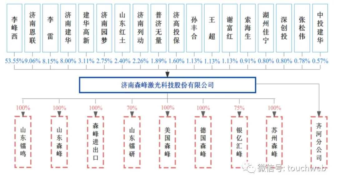IPO前,森峰激光实际控制人李峰西、李雷通过直接和间接方式合计持股35,202,085股,占总股本的61.76%。李峰西、李雷为夫妻关系。