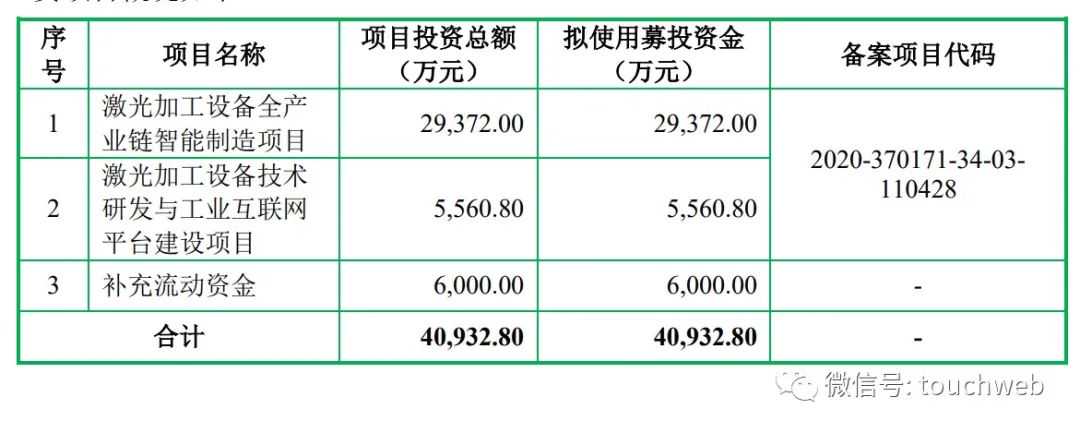 森峰科技计划募资4.1亿元,其中,2.94亿元用于激光加工设备全产业链智能制造项目,5560.8万元用于激光加工设备技术研发与工业互联网平台建设项目,6000万元用于补充流动资金。