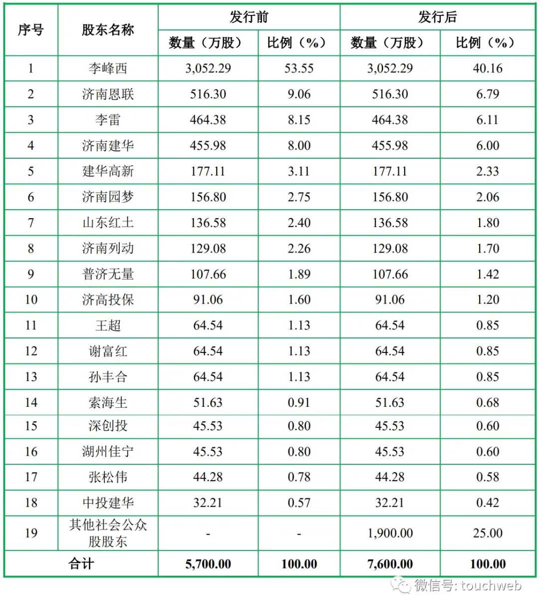 IPO前,李峰西持股为53.55%,济南恩联持股为9.06%,李雷持股为8.15%,济南建华持股为8%,建华高新持股为3.11%,济南园梦持股为2.75%,山东红土持股为2.4%,济南列动持股为2.26%,普济无量持股为1.89%,济高投保持股为1.6%;