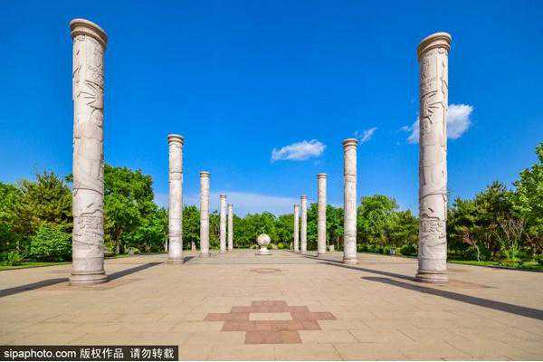 从西门进入公园,是一个小广场。广场两侧并列着12根石柱,上面雕刻着各种图案~