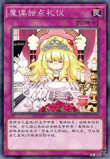 罠卡——魔偶甜点礼仪(陷阱卡)Manner礼仪,吃法国菜的其中一个礼仪是,刀叉只要用过就不能放下到桌子上,因此在大型晚宴的餐桌上经常会摆出大量刀叉以便更换。卡图中的魔偶甜点·布丁公主似乎是已经厌恶了这种规矩似的摆出一副苦瓜干的脸。左边手持写着Madolces'Manners本子的是魔偶甜点·橘子酱女仆,似乎是在对魔偶甜点·布丁公主教授餐桌礼仪。