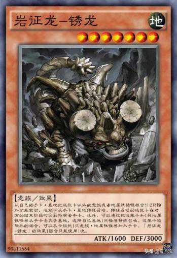 从自己的手卡·墓地把这张卡以外的龙族或者地属性的怪兽合计2只除外才能发动。这张卡从手卡·墓地特殊召唤。特殊召唤的这张卡在对方的结束阶段时回到持有者手卡。此外,可以通过把这张卡和1只地属性怪兽从手卡丢弃去墓地,选择自己墓地1只怪兽特殊召唤。这张卡被除外的场合,可以从卡组把1只龙族·地属性怪兽加入手卡。岩征龙锈龙的效果1回合只能使用1次。