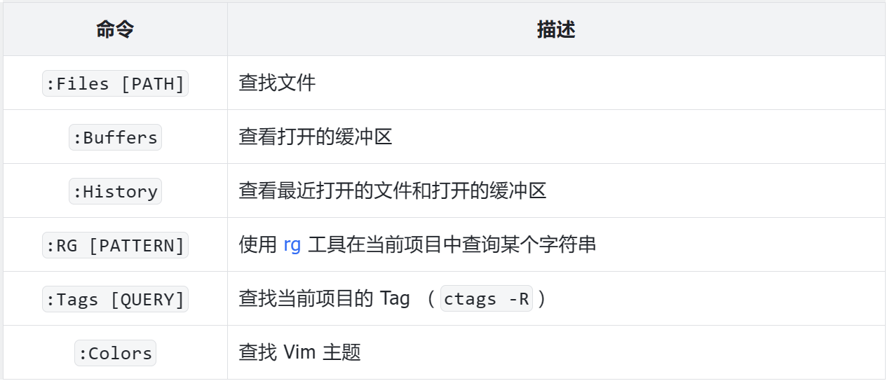 Plugin'junegunn/fzf',{'dir':'~/.fzf','do':'./install--all'}Plugin'junegunn/'fzf插件提供很多功能,比较重要的功能列表如下: