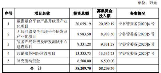 公司计划使用募集资金2.01亿元用于“数据融合平台产品升级及产业化项目”、8983.50万元用于“无线网络安全治理平台研发及产业化项目”、9331.28万元用于“装备产线升级及研发测试中心建设项目”、1.33亿元用于“营销服务网络建设项目”、6500万元用于“补充流动资金”。