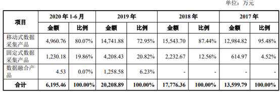 2017年、2018年、2019年和2020年1-6月,森根科技销售的移动式数据采集产品占营业收入比例分别为95.48%、87.44%、72.95%和80.07%,固定式数据采集产品占营业收入比例分别为4.52%、12.56%、20.82%和19.86%。