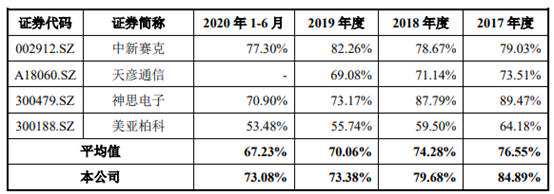 2017年至2020年上半年,同行业可比公司的毛利率均值分别为76.55%、74.28%、70.06%和67.23%。