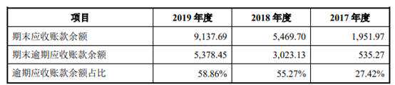 2017年末至2019年各期末,森根科技的逾期应收账款余额分别为535.27万元、3023.13万元和5378.45万元,大幅增加,同期的应收账款坏账准备余额分别为115.74万元、393.68万元和975.61万元。