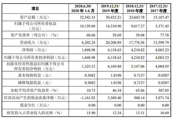 招股书披露,2017年至2020年上半年,森根科技实现营业收入分别为13,599.79万元、17,776.36万元、20,208.89万元和6202.24万元,净利润分别为4083.23万元、4210.82万元、6118.63万元和1848.98万元。