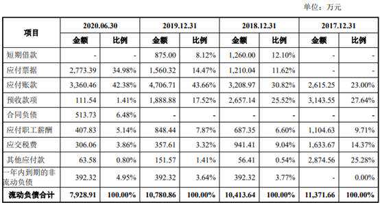 公司的流动负债主要由应付票据、应付账款等组成。2018年末、2019年末和2020年6月末,公司应付票据余额分别为1210.04万元、1560.32万元和2773.39万元,均为已开具尚未兑付的银行承兑汇票。
