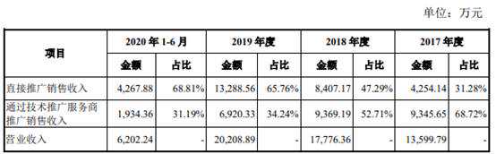 2017年至2020年上半年,森根科技通过技术推广服务商取得的收入占营业收入比重分别为68.72%、52.71%、34.24%和31.19%。