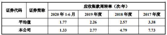 2017年末至2020年6月末,森根科技的应收账款周转率分别为7.73、4.79、2.77和1.33,同行业可比公司的应收账款周转率均值分别为3.38、2.57、2.26和1.77。