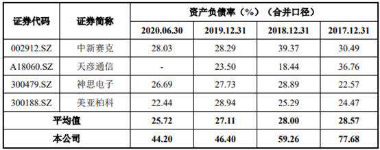 上述同期,同行业可比公司的资产负债率均值分别为28.57%、28.00%、27.11%和25.72%,流动比率均值分别为2.86、3.02、2.96和2.82,速动比率均值分别为2.29、2.48、2.48和2.25。