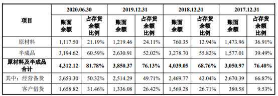2017年末至2020年6月末,森根科技的存货余额分别为3993.67万元、5874.23万元、5057.85万元和5272.69万元,主要由原材料、半成品和在产品构成。