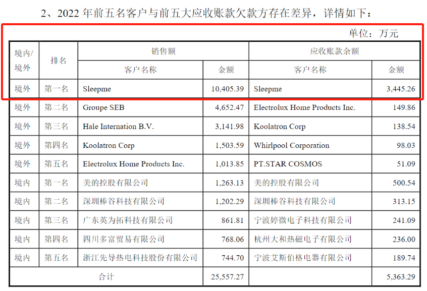 Sleepme是在2019年成为公司前五大客户之一,2019年公司对其的销售金额为5,213.27万元,到了2022年销售金额便达到10,405.39万元。在Sleepme的销售金额急速增长背景下,富信科技对Sleepme应收账款金额与周期却格外宽松。