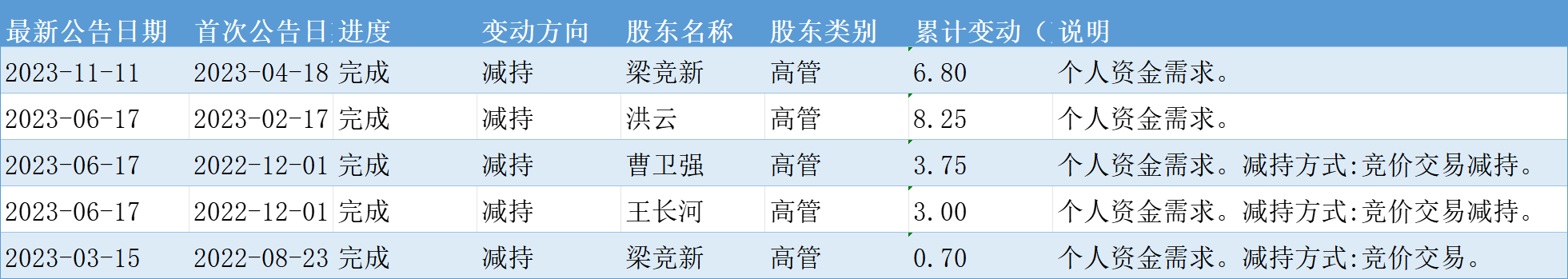 2022年12月,因个人资金需求,公司董事曹卫强先生计划减持公司股份数量不超过37,500股,即不超过公司总股本的0.0425%;监事王长河先生计划减持公司股份数量不超过30,000股,即不超过公司总股本的0.0340%。2023年6月上事高管完成减持计划,减持数量合计达到67,500股,减持总金额294.86万元。