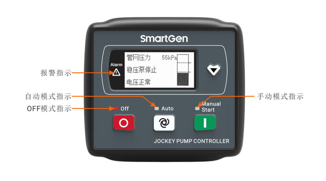 ——LCD可直观显示当前管网压力值、累计运行时间、泵起动次数、交流电源状态、报警状态;