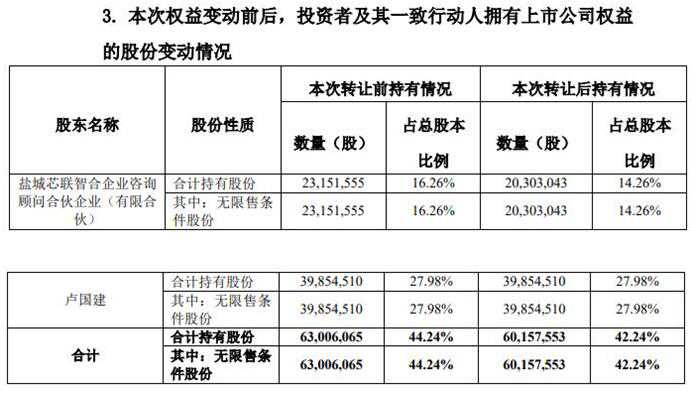 芯海科技公告显示,本次转让后,芯联智合持有公司股份比例将从16.26%减少至14.26%。控股股东、实际控制人卢国建及其一致行动人芯联智合持有芯海科技股份比例将从44.24%减少至42.24%。公司控股股东、实际控制人卢国建未参与本次询价转让,本次转让不会导致公司控股股东、实际控制人发生变化。