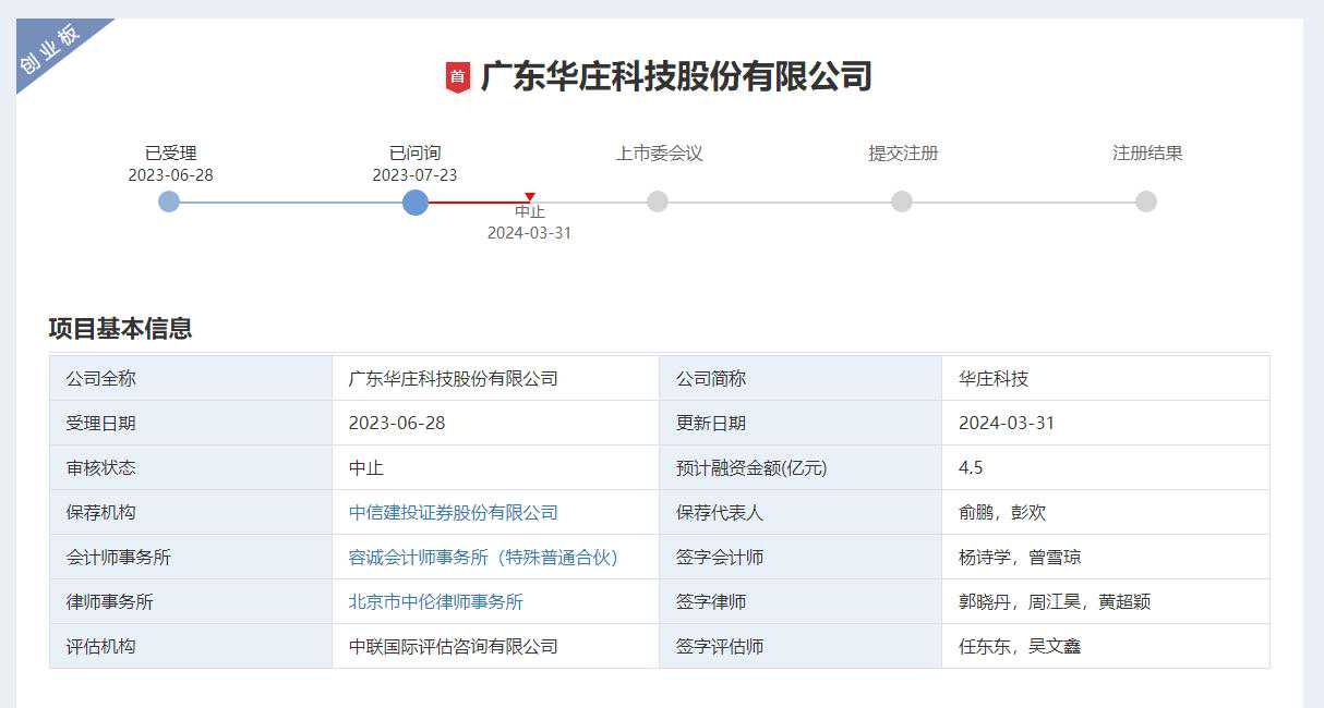 3月31日,深交所官网公布的信息显示,广东华庄科技股份有限公司(下称“华庄科技”)上市审核状态更新为“中止”,原因系发行上市申请文件中记载的财务资料已过有效期,需要补充提交。