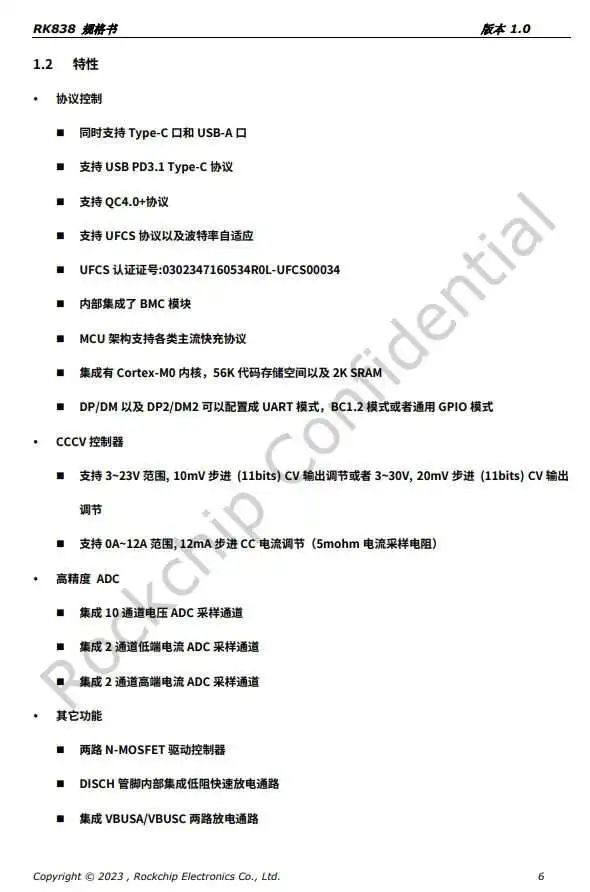 ROCKCHIP瑞芯微瑞芯微RK838瑞芯微RK838内置Cortex-M0内核,支持USB-A与USB-C双口快充,支持UFCS以及市面上多种主流快充协议,可以实现最高240W的充电功率,支持高精度的恒压恒流控制和超低的待机功耗。