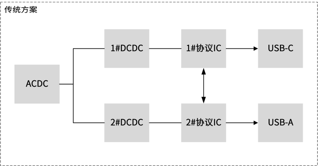 SC9712支持双芯片协同工作,实现双C口快速充电,且2C1A配置无需MCU控制。两个SC9712芯片可相互通信,实现单端口工作时全功率输出,双端口同时工作时自动分配功率。