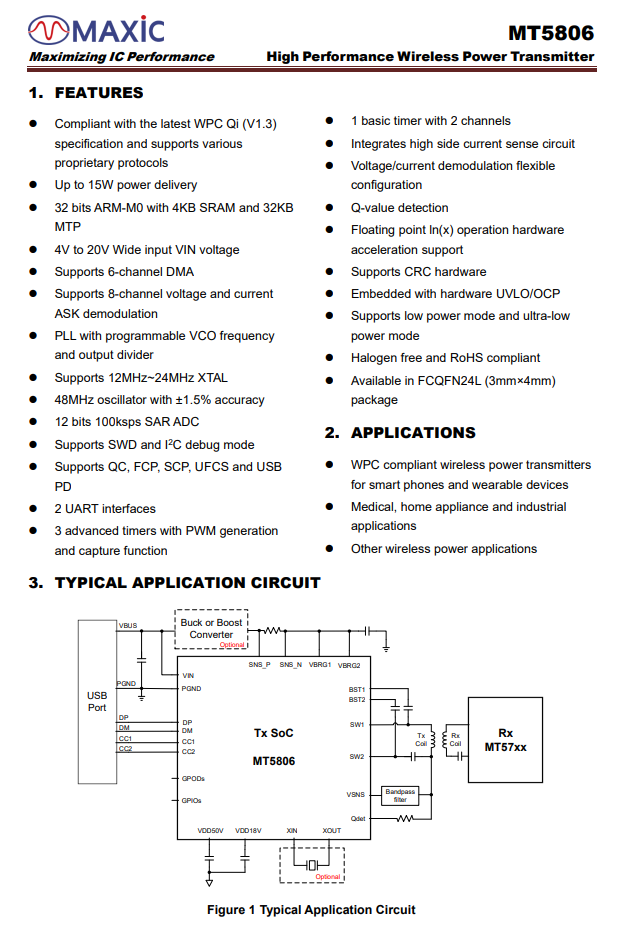 MAXIC美芯晟美芯晟MT5806MT5806是一款高度集成、高性能的基于磁感应的无线充电发射芯片。它完全符合最新的规范,支持BPP+EPP,并通过了UFCS融合快充认证。