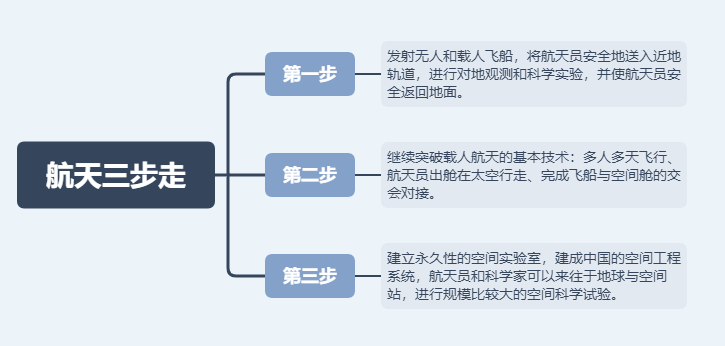第一步:发射载人飞船,建成初步配套的试验性载人飞船工程,开展空间应用实验。