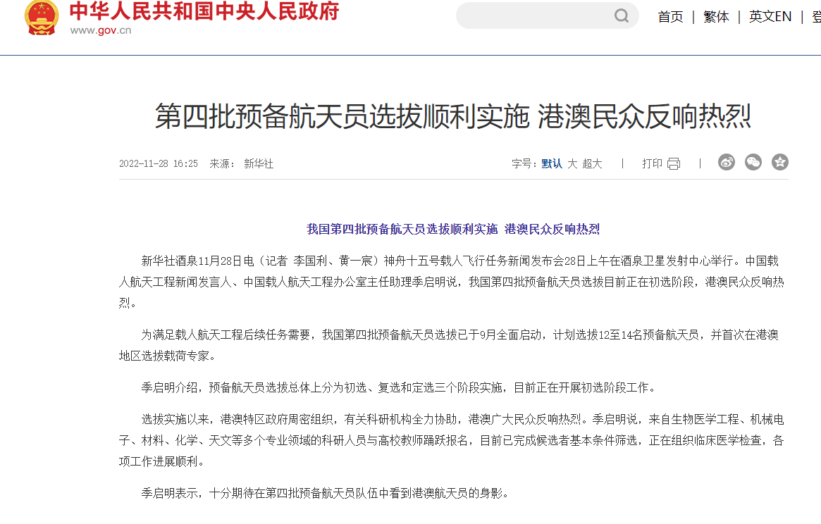 另外,我国还在港澳地区选拔第四批航天员中的载荷专家,港澳青年听到之后都很激动,因为祖国强大了,港澳地区的载人航天梦也实现了,不少人踊跃报名。
