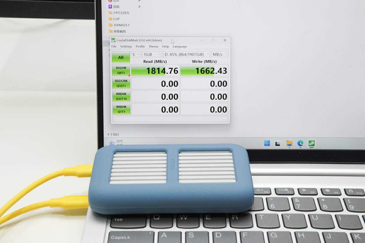 速率测试使用USB4硬盘盒连接固态硬盘和笔记本的雷电端口,内部装载三星980Pro固态硬盘进行实测传输速率。