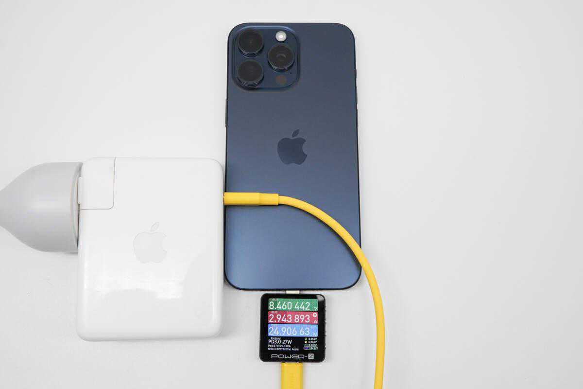 使用苹果140W充电器+同轴科技240WUSB4数据线对iPhone15ProMax手机进行充电,实测当前手机输入端功率为8.46。