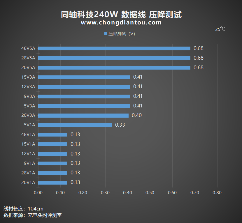 压降测试压降测试是衡量线材质量的一个重要因素,在日常使用中为手机充电,电压电流经由充电器输出到线材的一端,然后传输到线材的另一端到手机,这其中线材两端的传输就涉及到了压降方面数据。