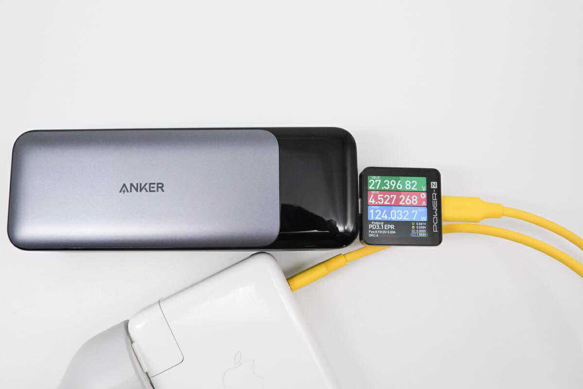 使用苹果140W充电器+同轴科技240WUSB4数据线对支持双向传输的充电宝进行充电,实测当前充电宝输入端功率为27.4,支持5A电流传输、PD140W电能传输。