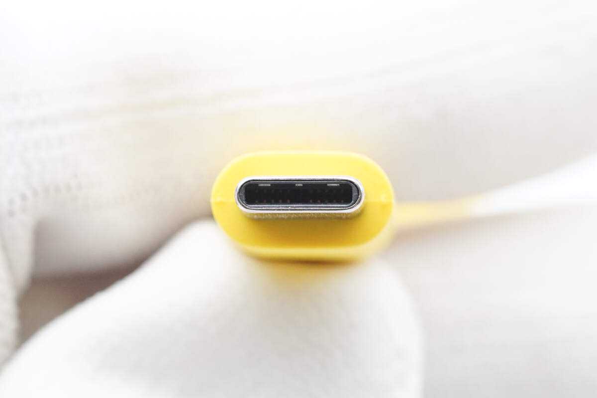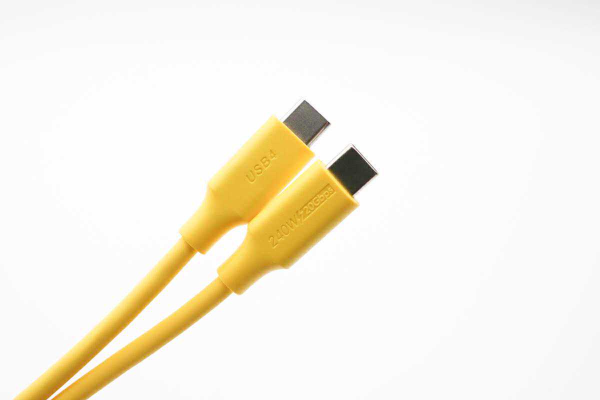 以明黄色款式的同轴科技240WUSB4数据线为例,它的子端外壳为细纹磨砂处理的PC材质制作,与线身连接处为模内注塑成型工艺,加厚处理,更耐弯折、拉扯。此外,外壳上凹印“USB4”“240W20Gbps”等字样。