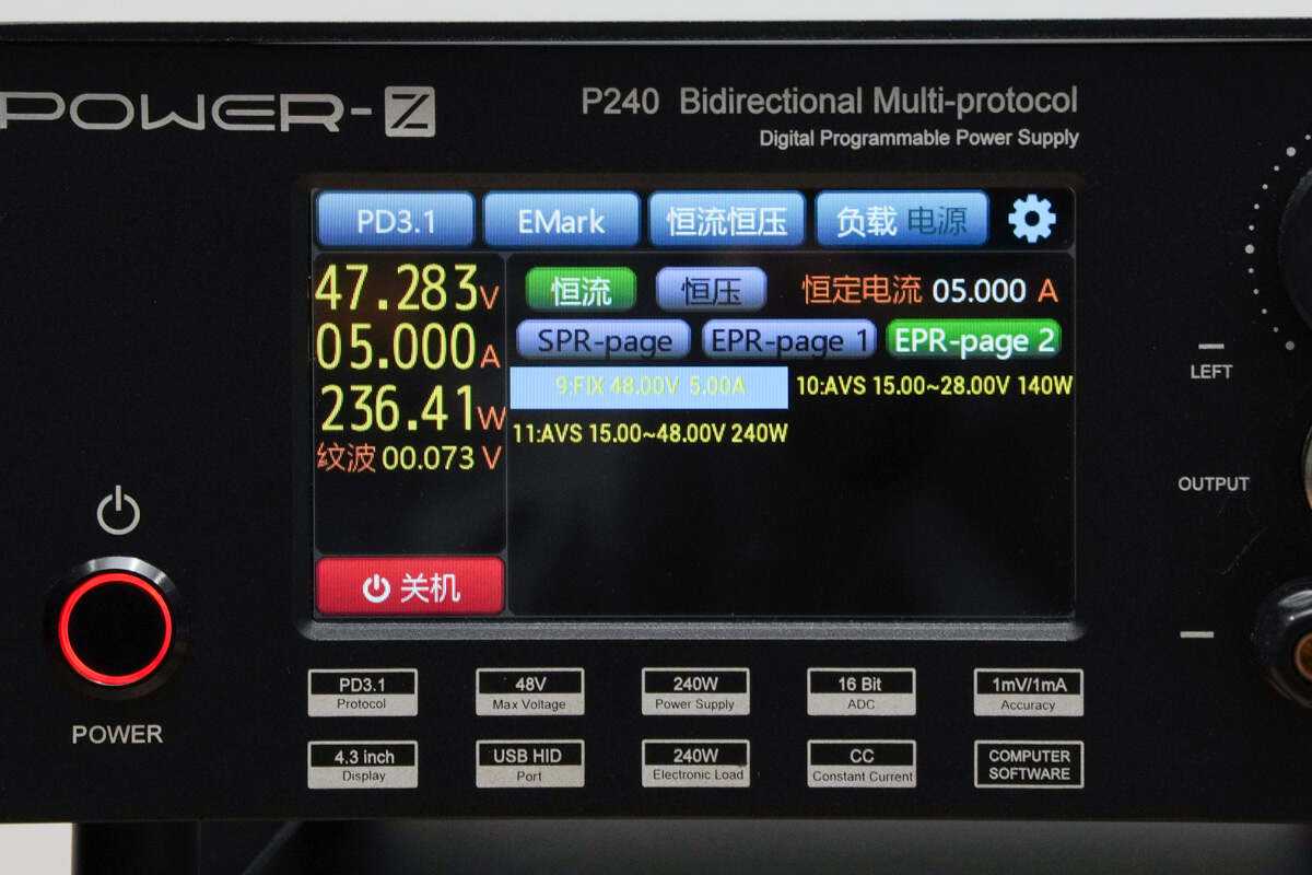 实测电源输出48V5A240W功率,负载输入显示47.283,实测同轴科技240WUSB4数据线符合240W电力传输描述。
