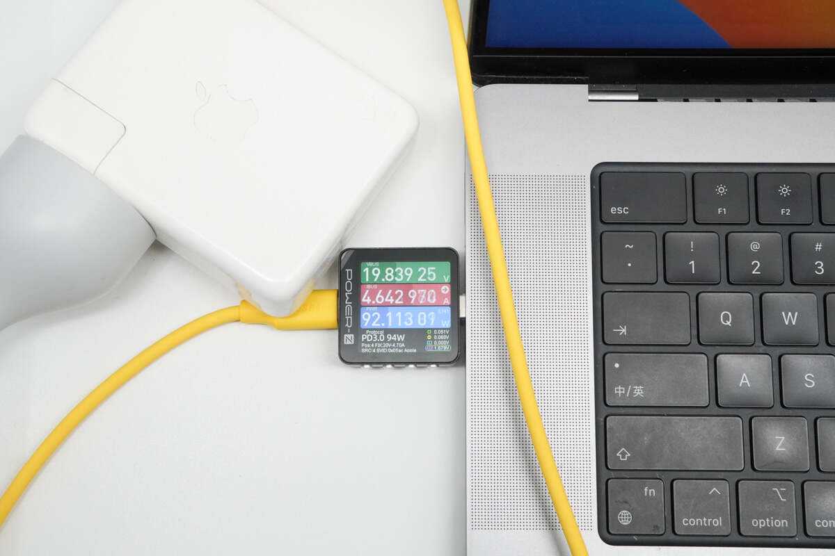 使用苹果140W充电器+同轴科技240WUSB4数据线对MacBookPro16M1Max笔记本进行充电,实测当前笔记本输入端功率为19.84。