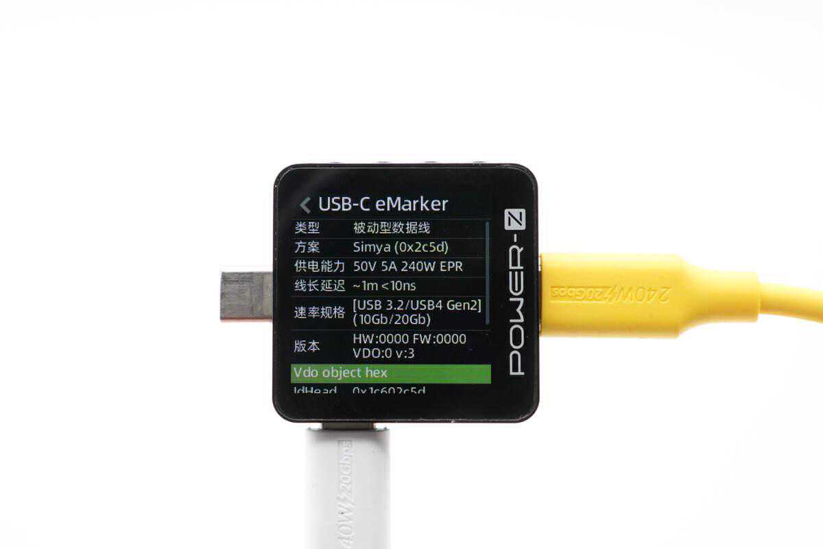 通过POWER-ZKM003C测试仪读取同轴科技240WUSB4数据线E-Marker芯片信息,实测线材支持50V5A240WEPR电力传输和/USB4Gen2(10Gb、20Gb)数据传输能力。