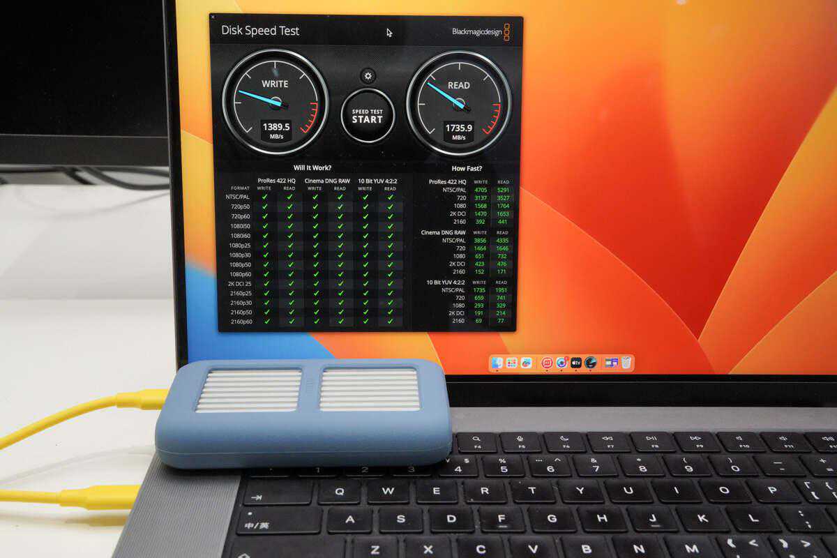 在macOS系统端,使用DiskSpeedTest测试同轴科技240WUSB4数据线的数据传输能力,实测读取速度可达1735.9MB/s,写入速度可达1389.5MB/s。