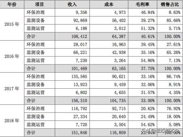 根据上表,环保治理业务销售占比从2015年8.63%上升为2018年的76.92%,而毛利率从46.84%下降到20.62%。其中监测设备销售占比从85.66%下降到18%,2017年曾一度降到8.91%。