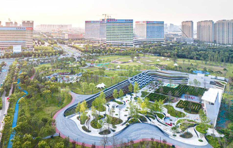公园多元化的设计与中央创新区相互辉映,形成了一个四季常青、三季有花的区域新城。与此同时,随机散落的休闲场所与多样化的景观座椅,打破了水泥柏油与绿地的界限,将人行空间融入城市景观。