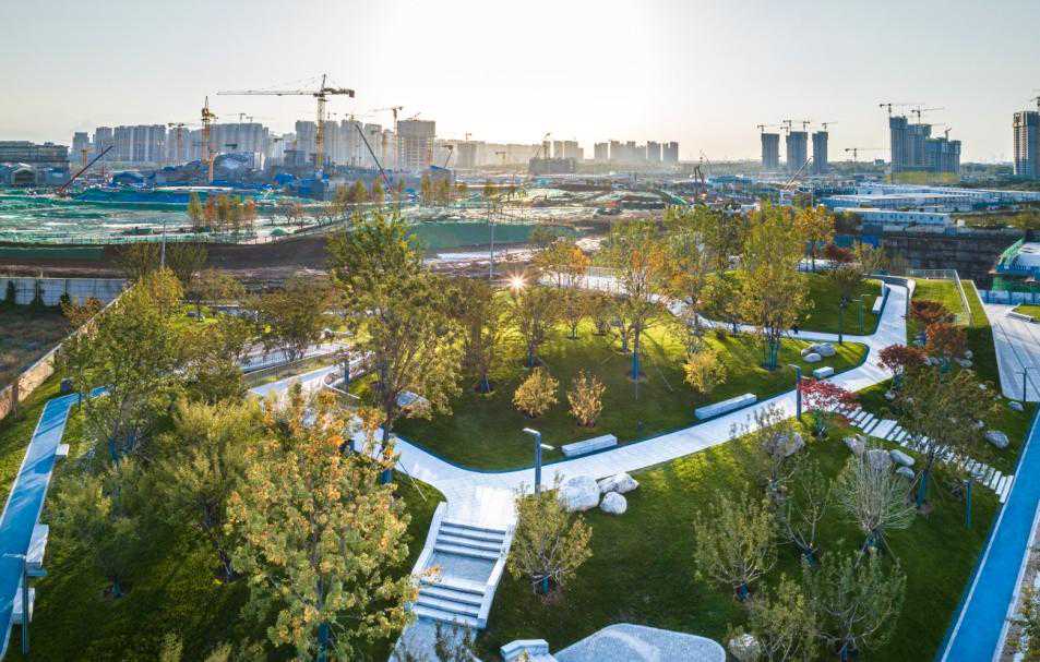 践行绿色生态发展理念是中央创新区的一大亮点,充分利用园区自然基底,夯实生态屏障、凸显生态优势,丰富公园绿地的综合体验,构建街角公园、道路绿带公园、口袋公园等公园绿地系统。