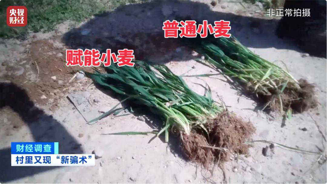 这位负责人带记者来到位于平顶山市叶县的一处农田,地头上竖着一块牌子,醒目地写着“量子能量波赋能增产试验田”。这位负责人拿着试验田中挖出的小麦与没有赋能的小麦进行对比,并表示赋过能的小麦秆更粗壮。