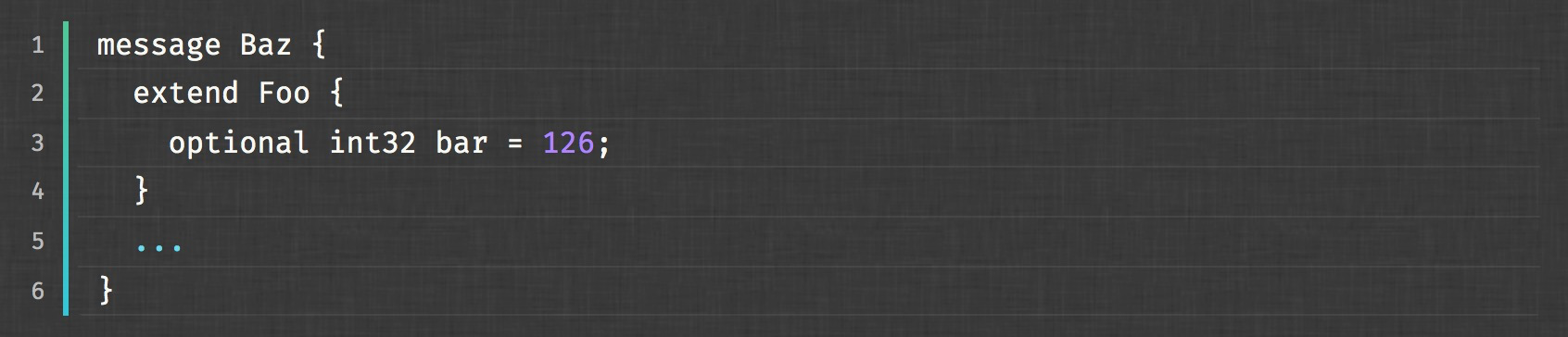 这个例子表明:在消息Foo中,范围[100,199]之内的字段标识号被保留为扩展用。现在,其他人就可以在他们自己的.proto文件中添加新字段到Foo里了,但是添加的字段标识号要在指定的范围内——例如: