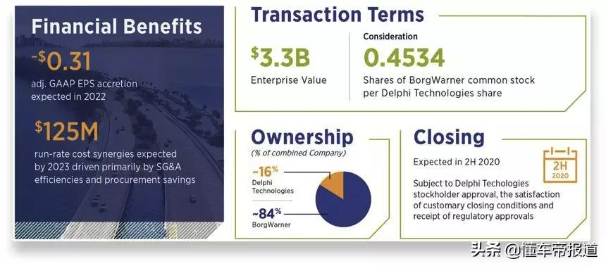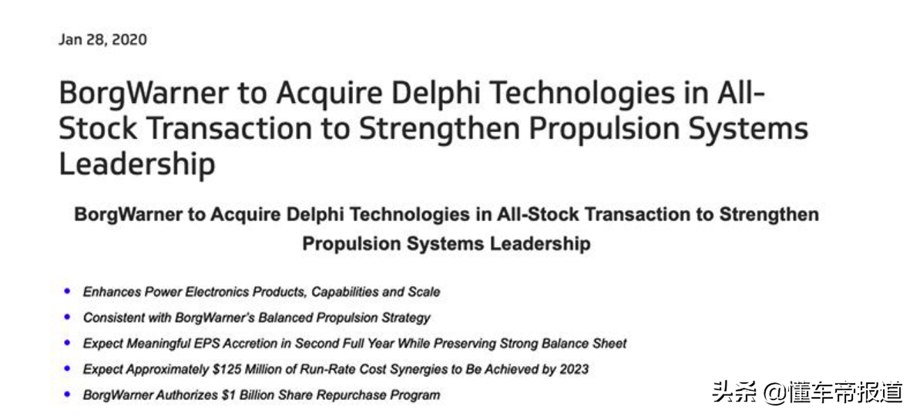 博格华纳宣布以33亿美元(约合人民币228.9亿元)的价格全资收购德尔福科技。交易完成后,原博格华纳股东将占合并后集团股权的84%,而德尔福科技现有股东将拥有约16%的股份。博格华纳CEO弗雷德里克·利萨尔德表示:“这项令人激动的交易充分体现了我们的动力系统发展战略,德尔福科技可以给我们带来更成熟的电子电器技术以及宝贵的人力资源,而博格华纳也将在呼混合动力汽车和电动汽车动力系统厂品方面更加具有竞争力。”