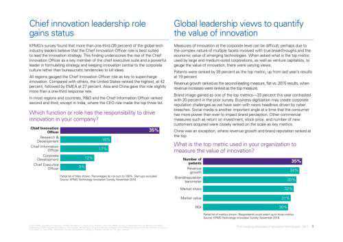 毕马威要求这些领导人列出他们公司量化创新价值的关键指标。位居第一的是专利数量(35%这么认为),紧随其后的是营收增长、品牌/声誉指标、市场份额、市值和投资回报率。