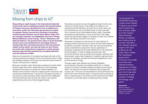 毕马威报告详细分析了全球15个主要国家和地区在科技创新上所取得的真正进展,包括澳大利亚、加拿大、中国、德国、印度、爱尔兰、以色列、日本、韩国、俄罗斯、新加坡、南非、台湾、英国和美国。每一个所提到的国家或地区在公共和私营部门都取得了实实在在的科技创新。