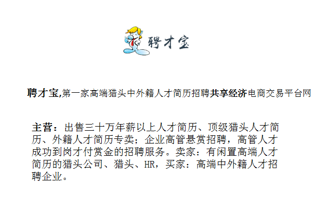 天津集翔科技集团在聘才宝已支付了58000元赏金招聘“常务副总裁”职位,等猎头、HR你抽空来推荐合适人选赚走,符合该职位的职业经理人也可以来求职“自卖”成功后还“金榜题名”哦!需要的领走别客气!