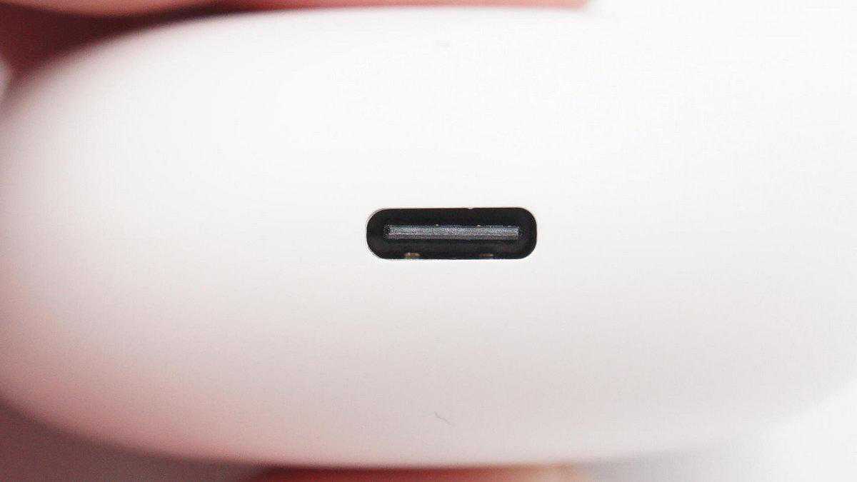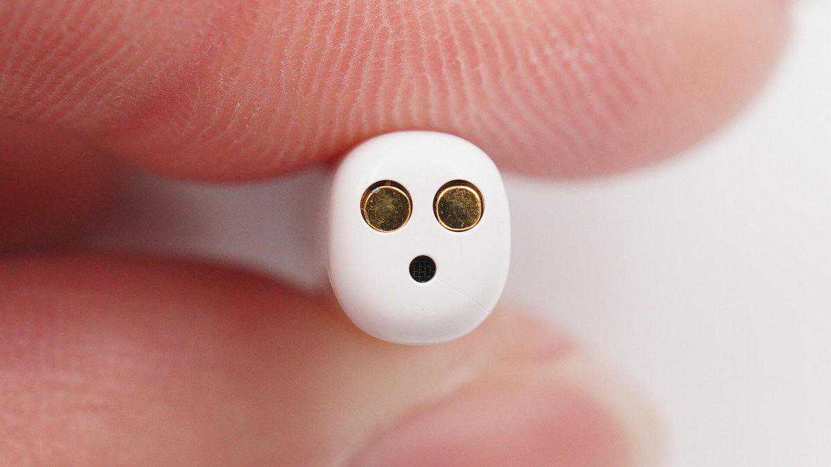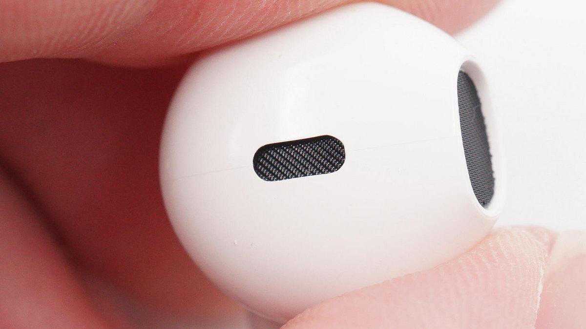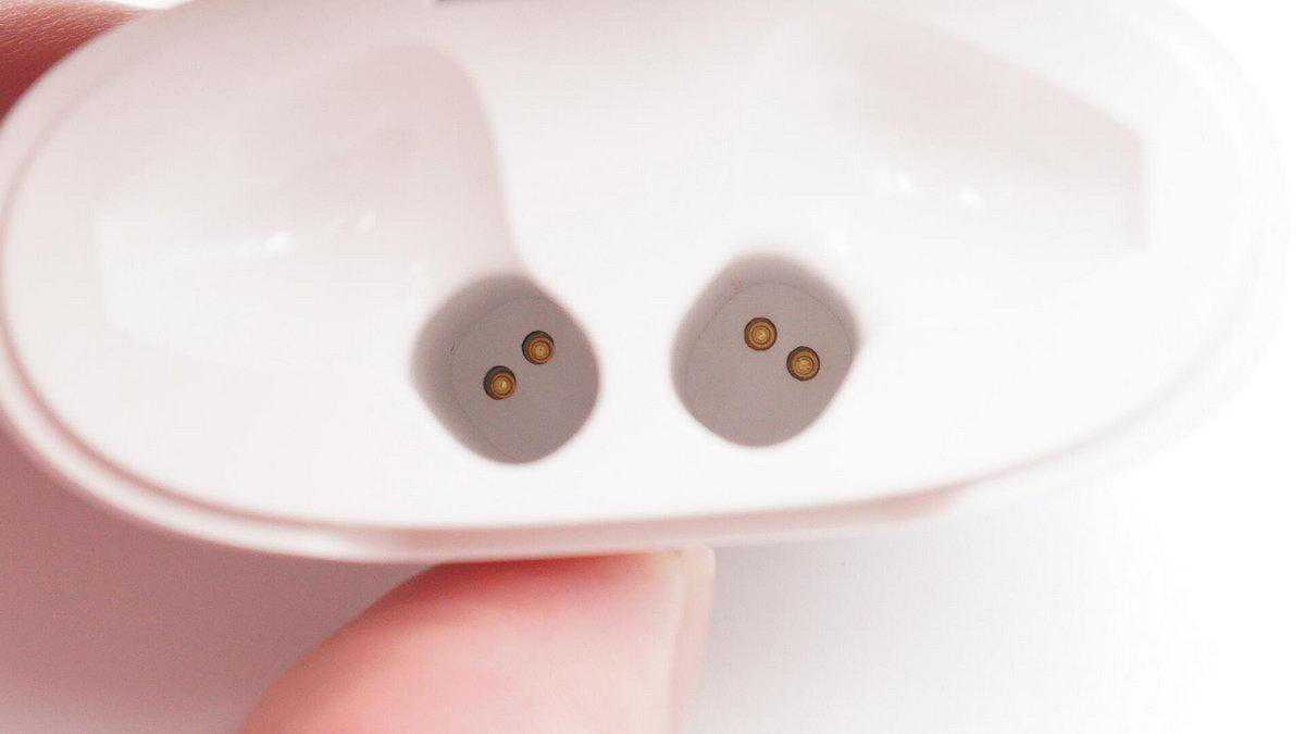 耳机柄底部的充电触点和通话麦克风拾音孔。
